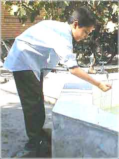 Pertama kali, berniatlah untuk berwudhu` dengan tujuan mendekatkan diri kepada Allah. Ambillah air wudhu` dengan tangan kanan.