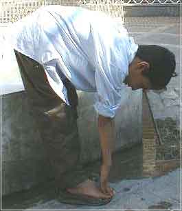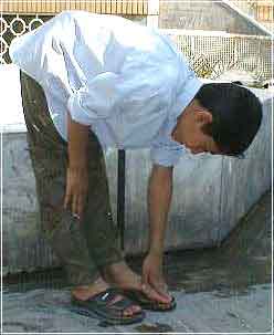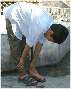 Setelah itu, usaplah kaki kanan Anda dengan sisa air yang ada di tangan kanan dari ujung jari kaki hingga pergelangan kaki. Anda tidak diperkenankan mengambil air baru untuk mengusap kaki kanan.